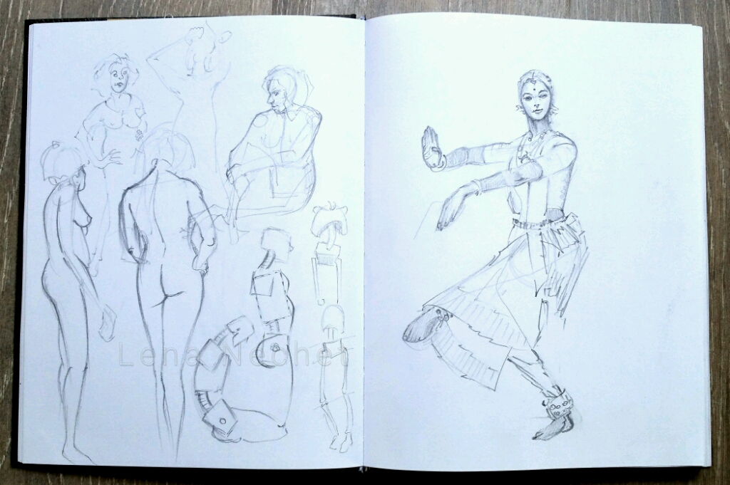 Life nude model drawing and a sketch of an Indian folk dancer on two pages of my sketchbook.