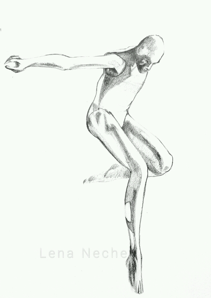 Drawing studies of ballet dancers, five figures in motion on two pages of my sketchbook.